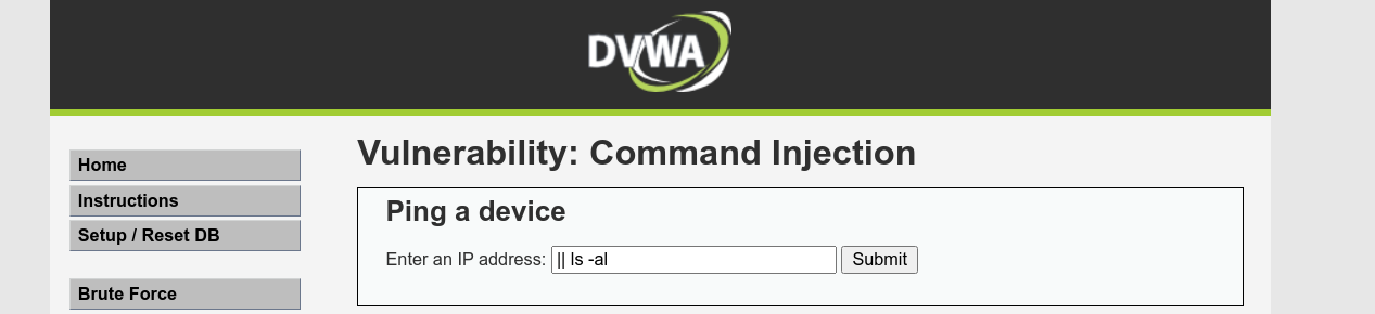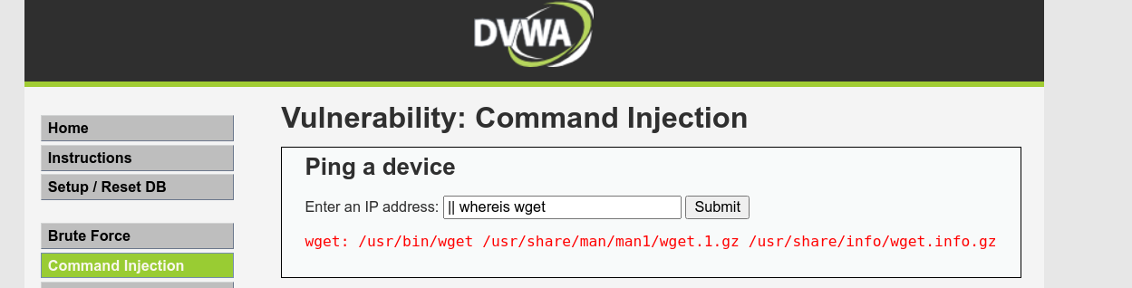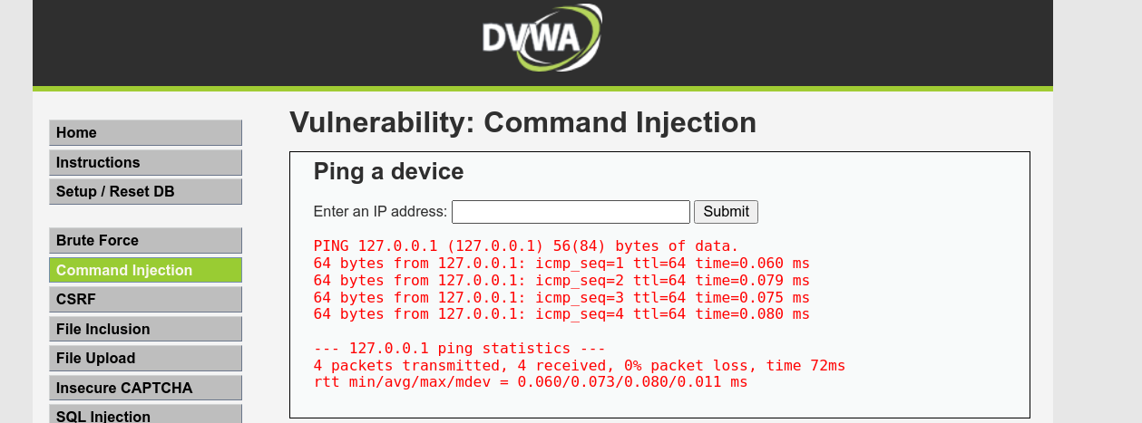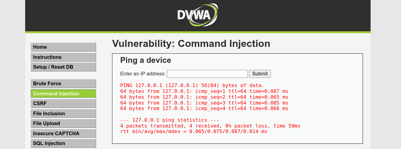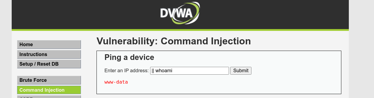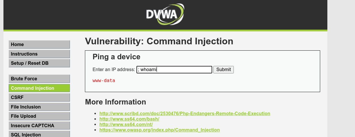 Since we do know our instance of DVWA is running on a linux host, we were able to inject code into the command by using a semi colon, which act as a command separator;