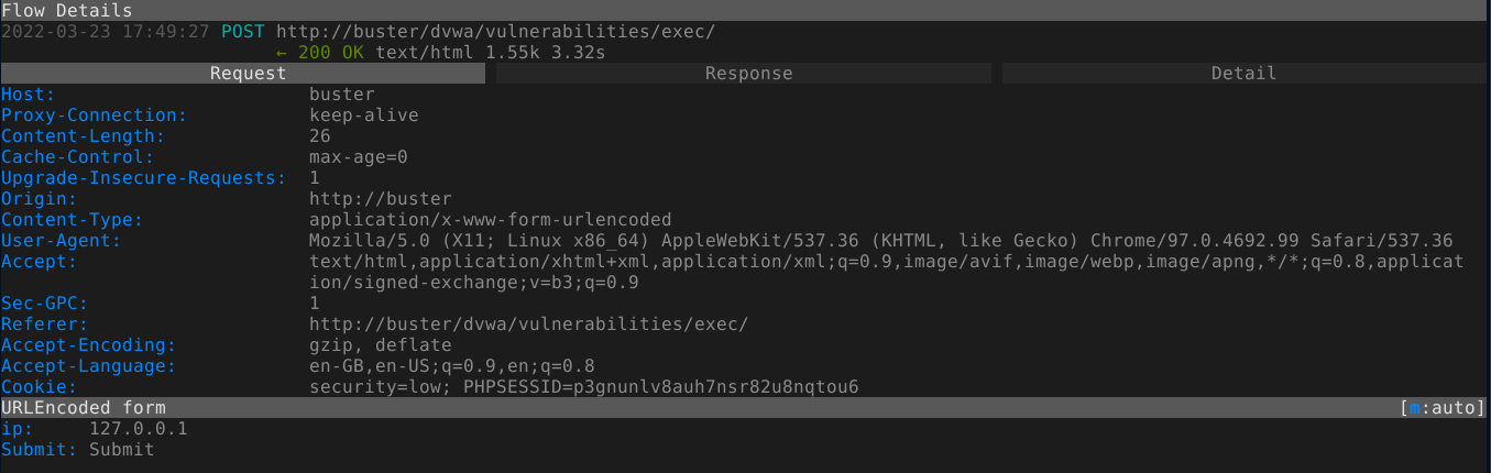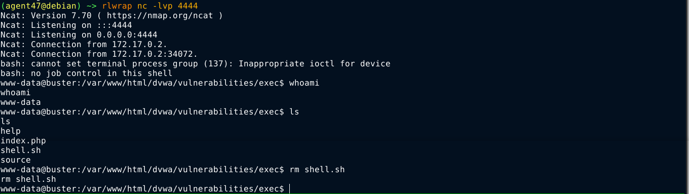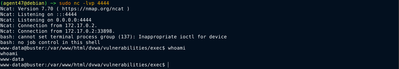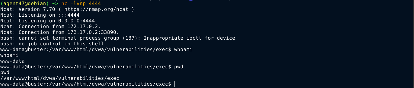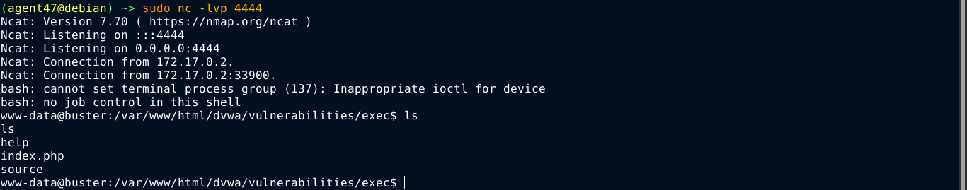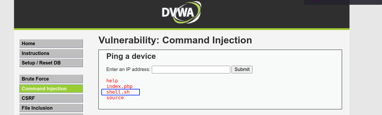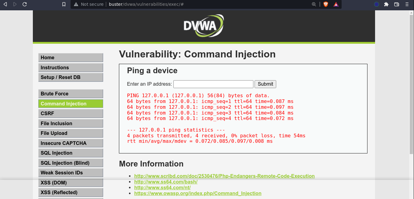 Since we do know our instance of DVWA is running on a linux host, we were able to inject code into the command by using a semi colon, which act as a command separator;
