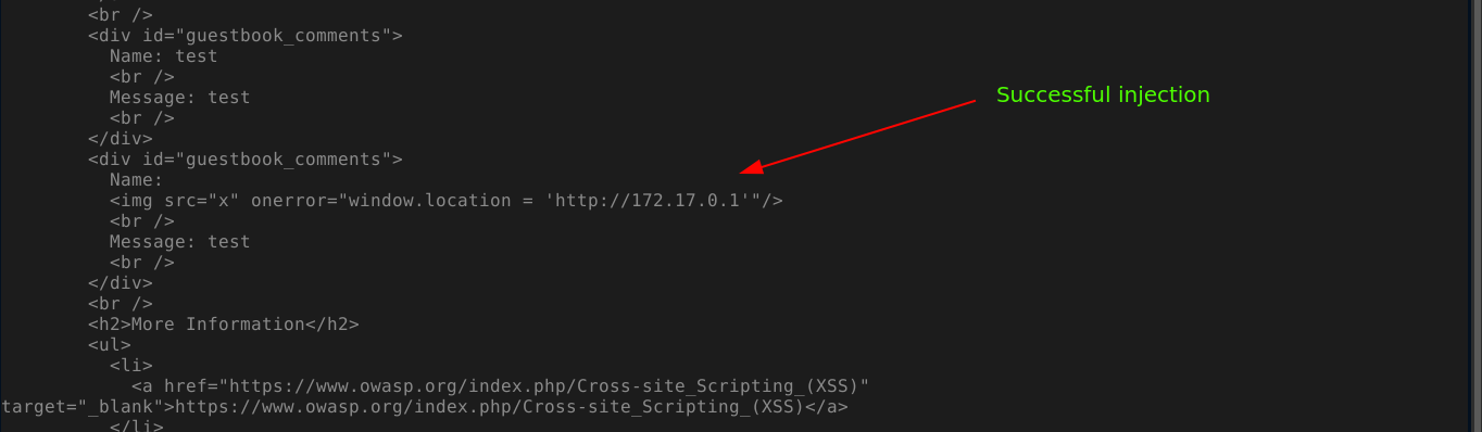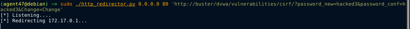 Now we can set our stored XSS exploit to redirect user to our HTTP redirector, which will further redirect to our CSRF URL. The first redirect can be achieved using <img> tag with a broken URL that executes the JS code defined by onerror;