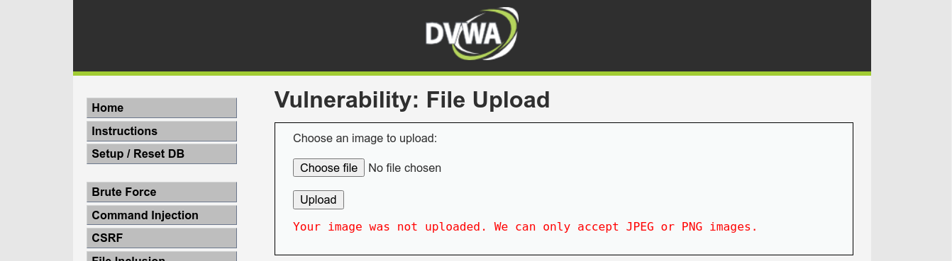This is an exercise in OWASP DVWA for exploiting file upload vulnerabilities.