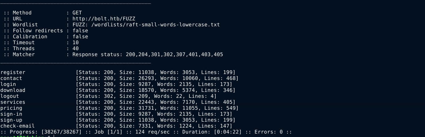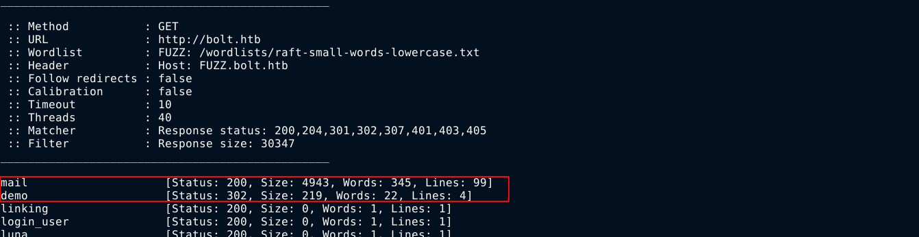 So I made a request to create an account through Burp Suite and added the invite code, but it still gave me a 500 error. Testing the invite code on the passbolt.bolt.htb domain also didn’t work. This didn’t make much sense, and made me believe the source code I am auditing may actually be for a different service. So I used ffuf to fuzz for hidden subdomains again, and I got 2 hits (the last 3 were due to ffuf bugging out after I hit CTRL + C);