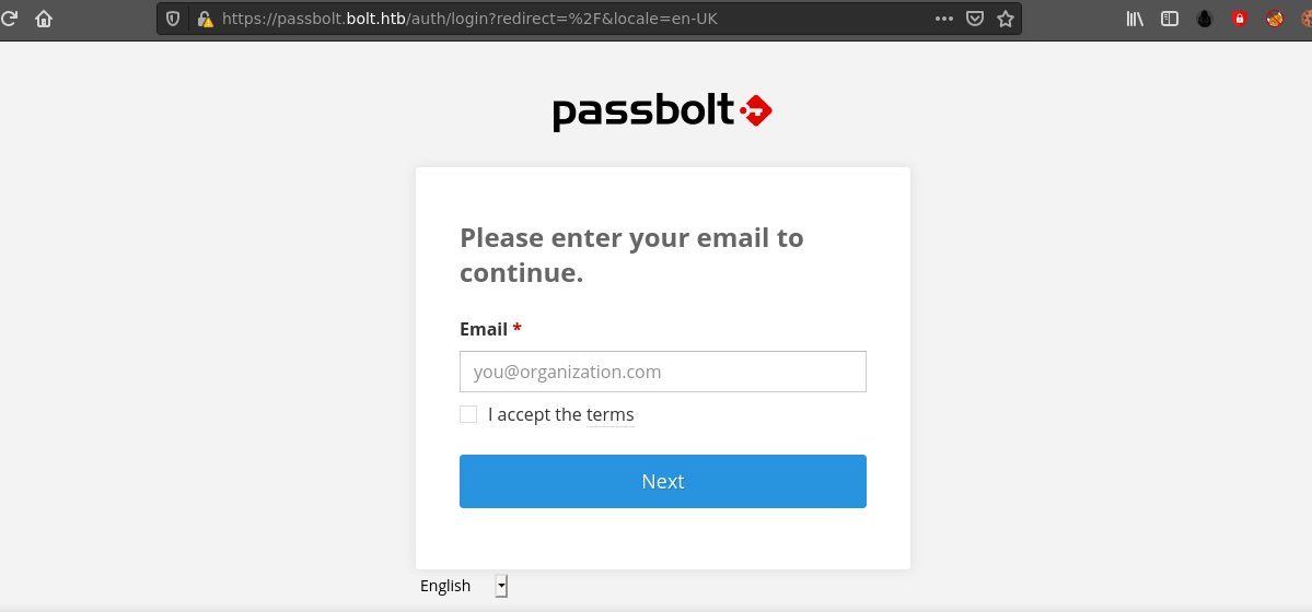 NMAP earlier identified a web service on port 443 (HTTPs) with the name passbolt.bolt.htb. Loading the page, it presents itself as an open source password manager;