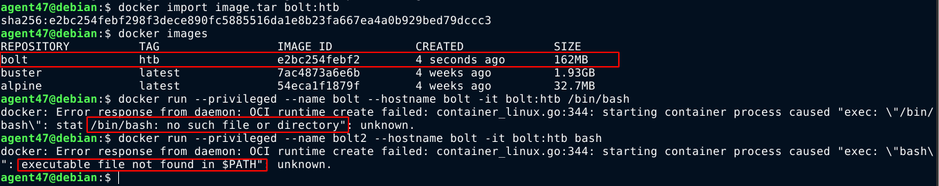 I downloaded the docker image from the site at http://bolt.htb/download. The image is a .tar archive, which is the format used to export docker containers. Using the docker import command, I was able to import the docker image on my local host, but I was unable to run any command on it, saying executable file not found in $PATH for relative paths, or no such file or directory for absolute paths;