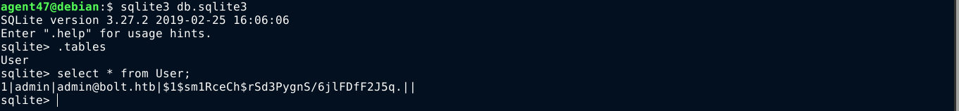Since the image is just a .tar archive of the file system of the docker container, I extracted it using the command tar -xvf image.tar and go through the extracted files manually. I found the source code of the web application, and an sqlite database containing the password hash of the user admin@bolt.htb;