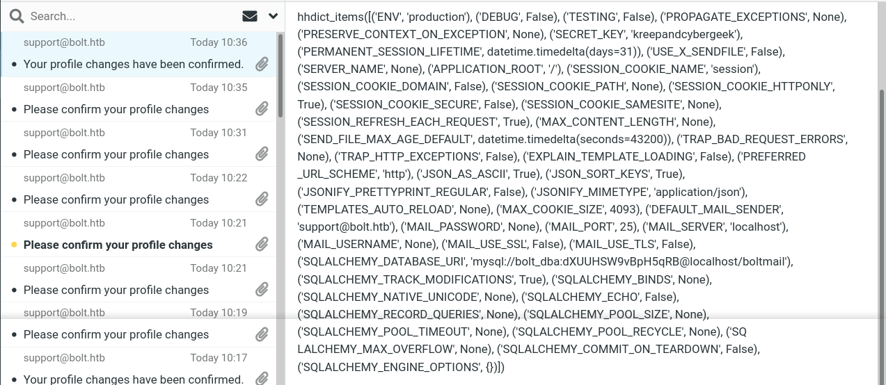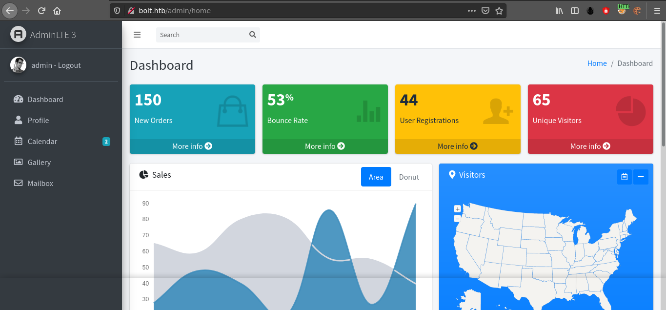 - Enumerated the docker image provided by the site, and found a credential for admin@bolt.htb, which gave me access to the admin dashboard at http://bolt.htb/admin/home