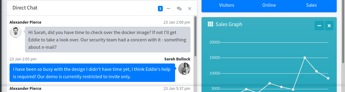 Most of the links in the admin dashboard are dead. I did find a few messages exchanged between some Alexander Pierce and Sarah Bullock in which they were talking about a security concern regarding emails;