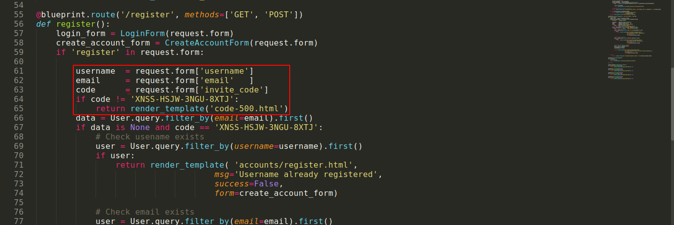 Sarah saying the demo is restricted to invites only made me believe this is the reason I couldn’t create an account on the web application. Going through the source code of the web application extracted from the docker image, the file app/base/routes.py was found to contain the code used to create an account. The code validates account creation requests using the parmater invite_code that must be equal to XNSS-HSJW-3NGU-8XTJ;
