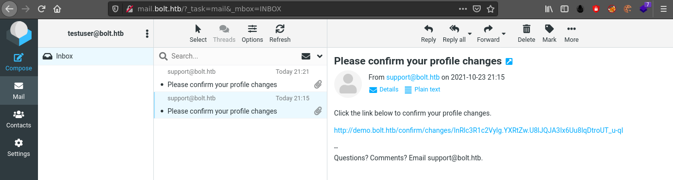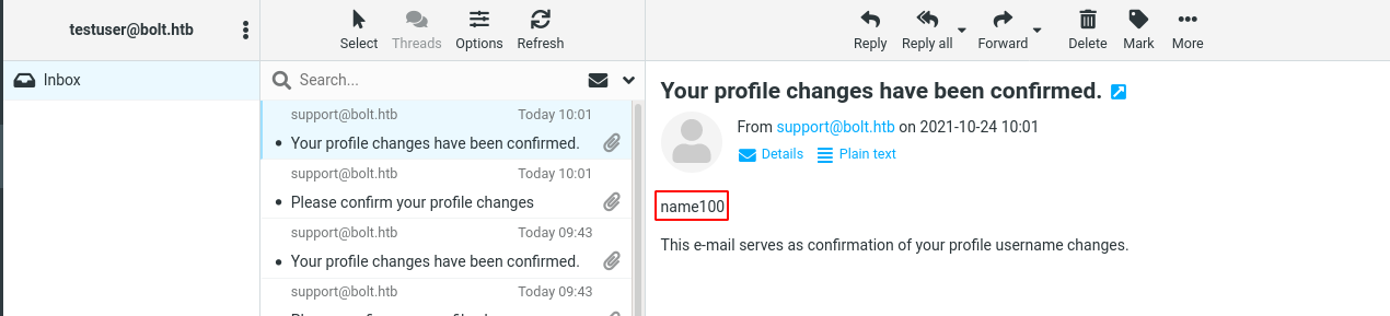 The page at http://mail.bolt.htb also gave me a login form. Using the credentials of admin:deadbolt, I got an error message that says Connection to storage server failed. Googling this error showed that it happens usually due to configuration errors. Using the test credentials I used to access demo subdomain, I was able to login to the webmail application. This means the web app is creating an email account for every user that signed up on the demo page;