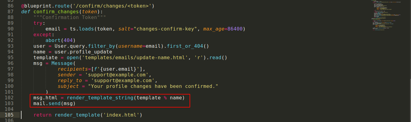 Going back to the demo portal, I have an option to update my profile, which sends a confirmation email to my account in the mail portal with a link to click to confirm changes. So I decided to look at how the functionality is implemented in the extracted source code, and found something very interesting. The way the web application generates the email sent to users to inform them about the changes made could be vulnerable to Server Side Template Injection (SSTI);