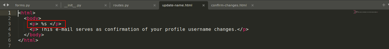 As can be seen in the image above, the name submitted during profile edit is injected directly into the template in the file templates/emails/update-name.html;