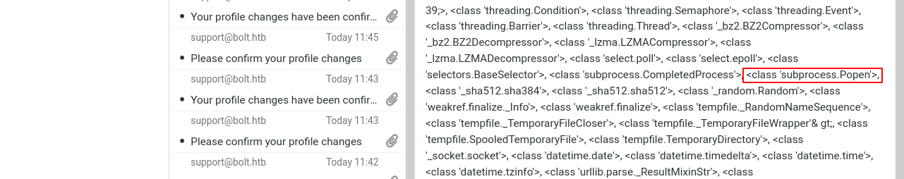 The index of subprocess.Popen in the returned list was found to be 222. This is all the info that is needed to gain code execution on the server. After testing using a local python3 installation, I was able to gain command execution on the host using the payload;