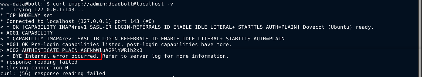 There is an IMAP service running locally, so I started testing the credentials I obtained in the docker image and the configuration files of the web apps. For the user admin account, I got an internal error;