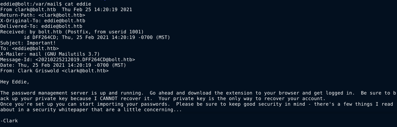 Checking his email file at /var/mail/eddie that I couldn’t access earlier, I saw an interesting message from clark;