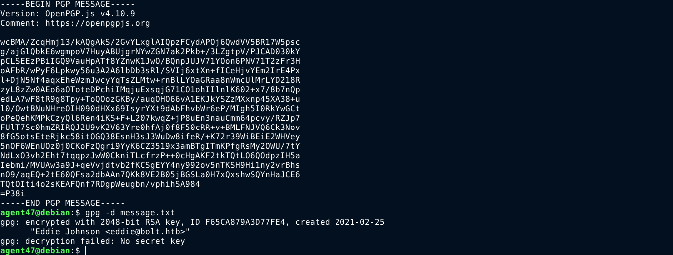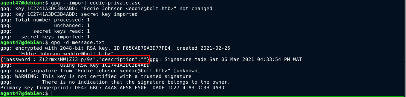 secretsin the MySQL database used by passbolt. The message was encrypted using eddie’s public key. - Found the private key of eddie inside a log file created by Chrome inside his home directory.