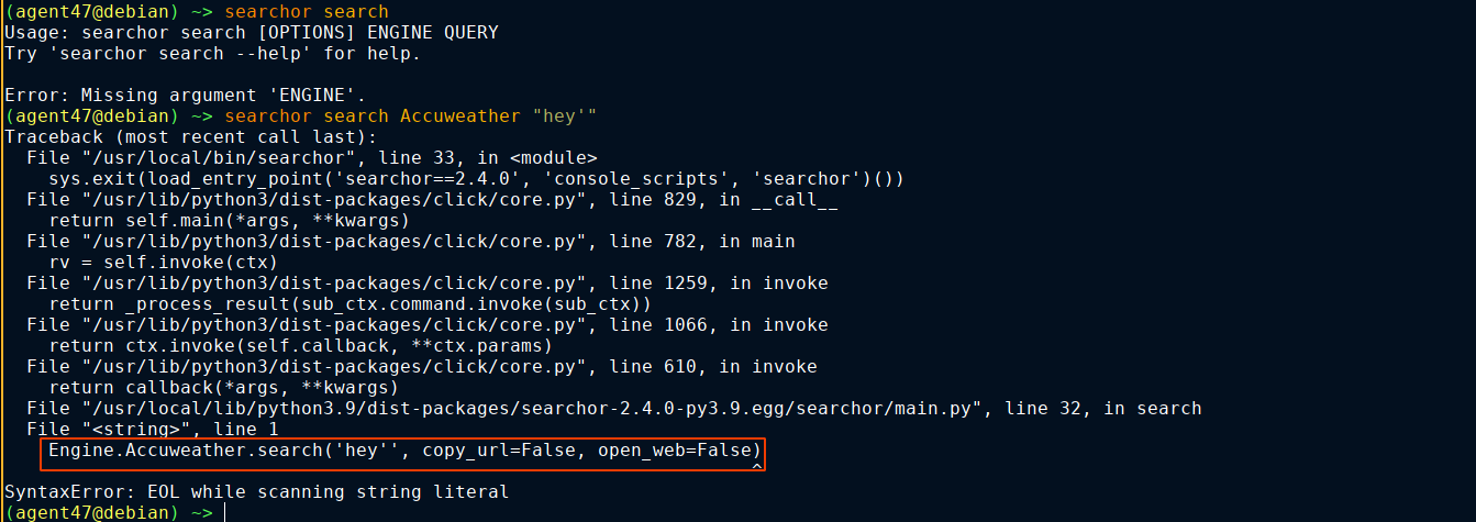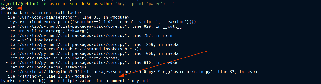 Notice how the ' in the call to Engine.Accuweather.Search is not balanced, and we were able to escape the quotation. This indicates our query is injected directly into a python code used to call the library. Testing this, we got code execution;