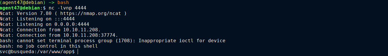 Testing on the box, I was unable to execute a bash rev shell directly. Had to curl it from my box, but it worked, and I got in as the user svc;