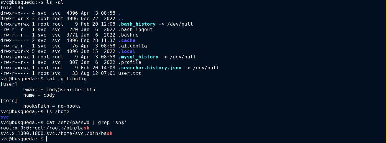 Can’t check sudo perms for svc as we still don’t have his password. .gitconfig file was found in the home directory, which is what is used to configure git;