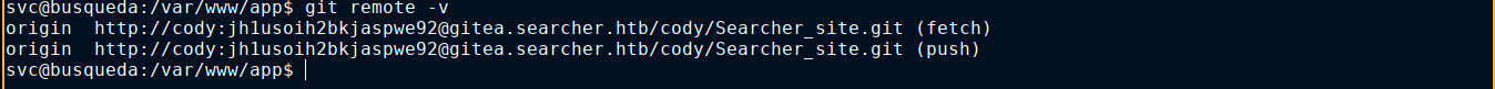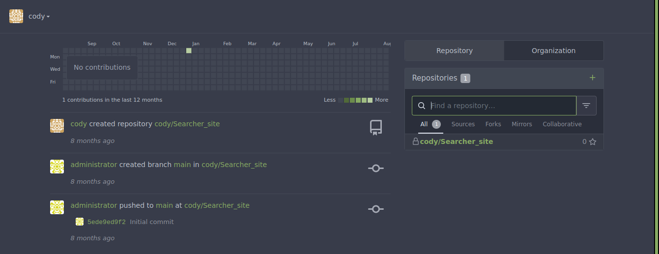 We already have the password of the svc user. Trying it on the Gitea instance didn’t work. But earlier we saw svc using the name cody in .gitconfig. Trying cody:jh1usoih2bkjaspwe92 allowed me to login;