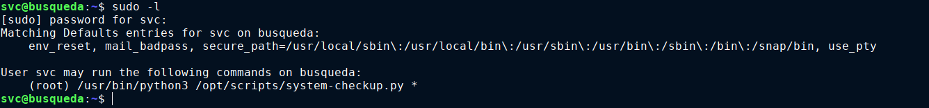 This is the same username that was found in /home/svc/.gitconfig. Testing the password on the account, I was able to login over SSH. sudo -l reveals a sudo perm on a custom script;