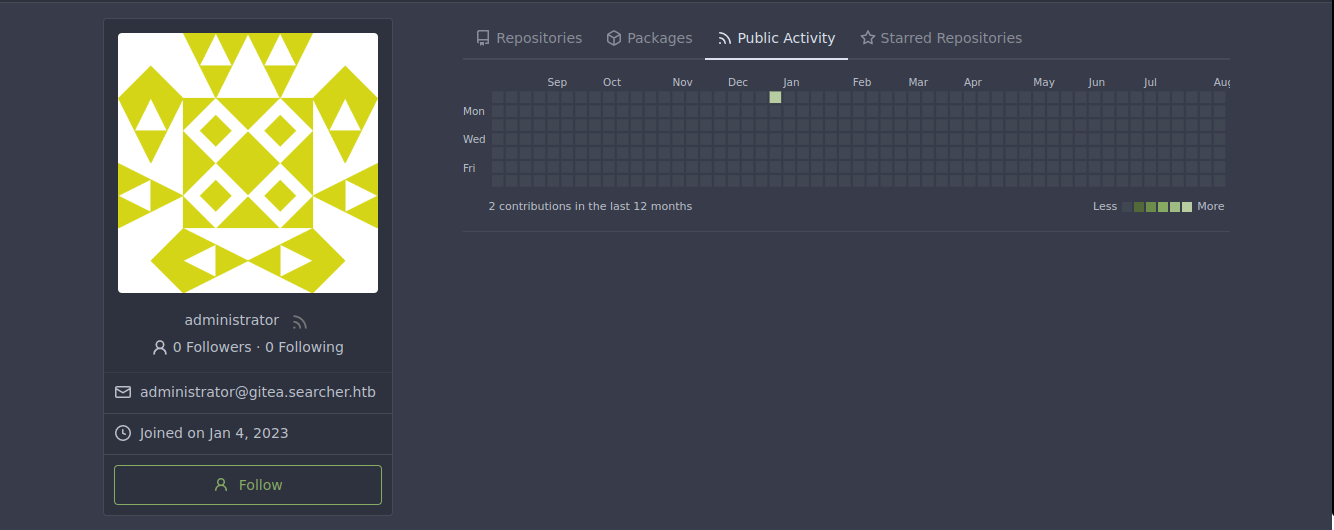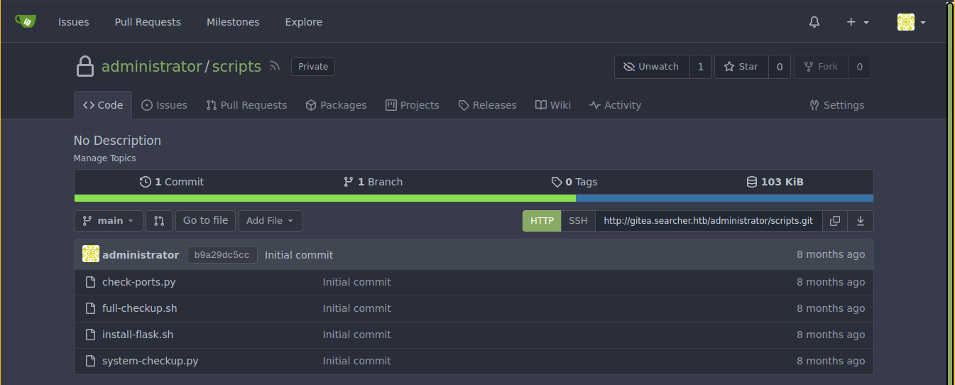 No need to crack this though as the password used for the Gitea MySQL database is also the password of the user administrator, and we now have access to a repo containing the source code of the sudo scripts;