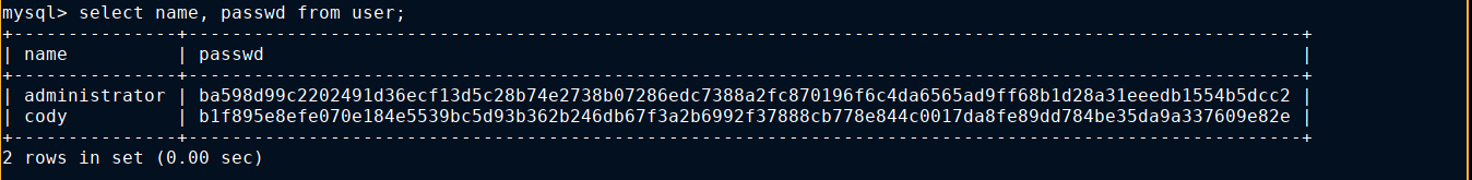 Remember docker-ps showed port 3306 (MySQL) is forwarded to the mysql_db container on the box. Was able to login successfully and get the hash of administrator;