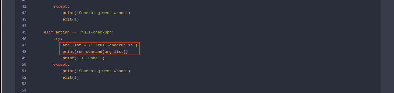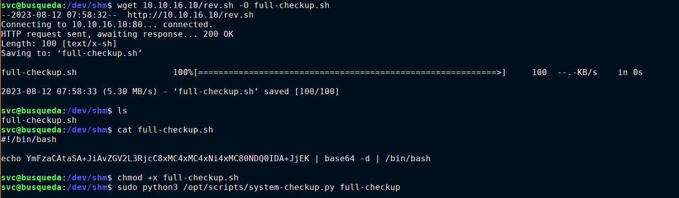 This makes the script vulnerable to arbitrary code execution as we could simply create a file in our current directory named full-checkup.sh and it wil be executed;