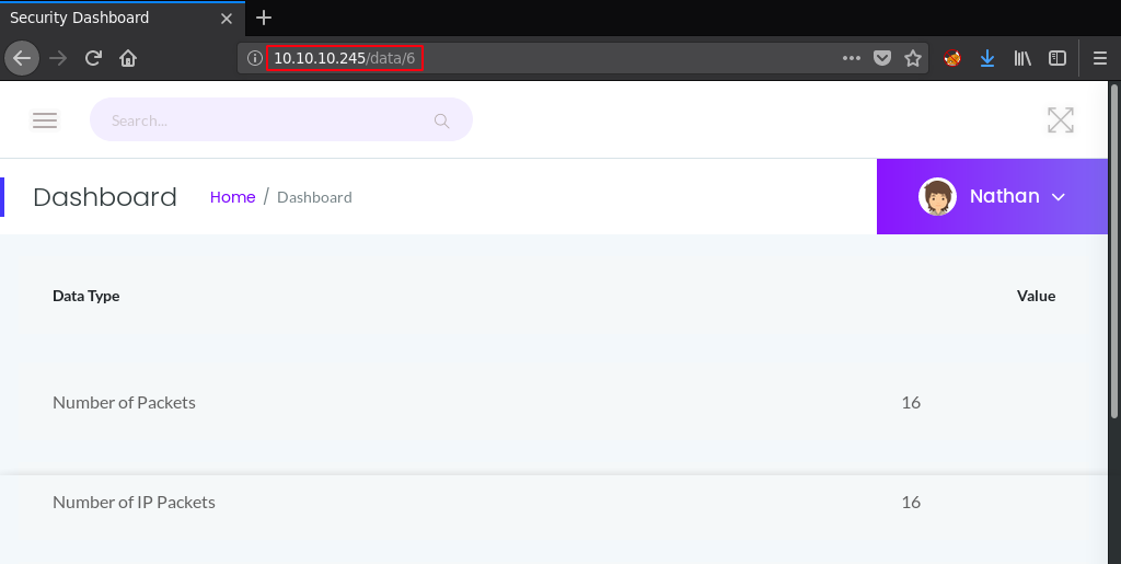 The web app provide an option for downloading pcap files. The path in the menu is /data/8, which contains only one packet. Bruteforcing the number in the URL revealed that /data/6 contains 16 packets.