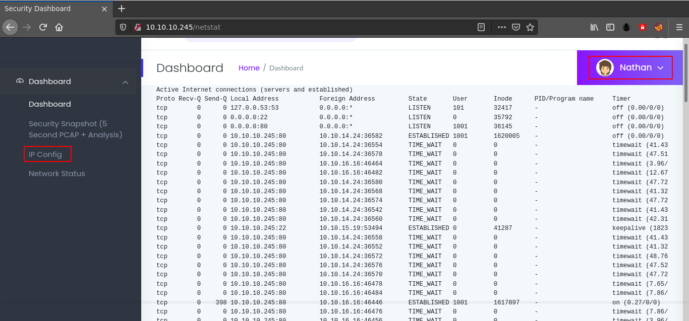In the navigation menu, there is a Network status option that showed some netstat output, and seemed to be running on the host. It also revealed a possible user named Nathan;