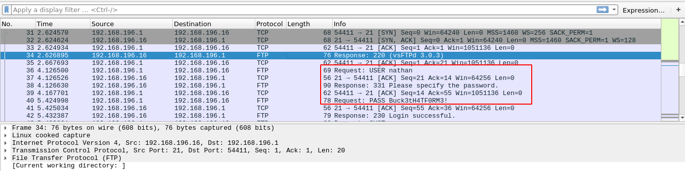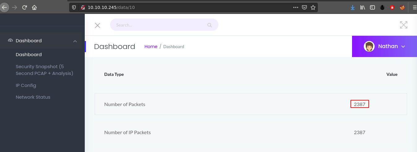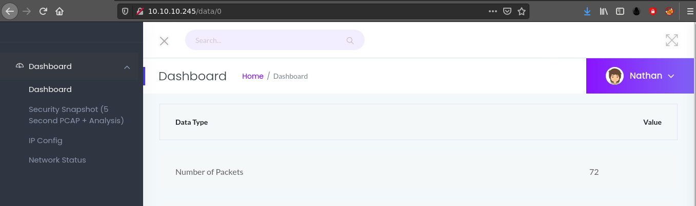 Every time a request was made to /capture, the web app hangs for 5 seconds (to capture the packets I guess?) and redirect user to /data/<n> (where <n> is a number) to download the captured PCAP. So I decided to bruteforce the number in hope of finding other PCAPs, and the first one yielded an FTP credential nathan:Buck3tH4TF0RM3!;