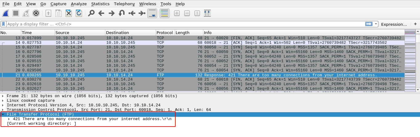 The packets captured during the DoS attack indicate the FTP server rejecting connections from our host due to too many connections made;
