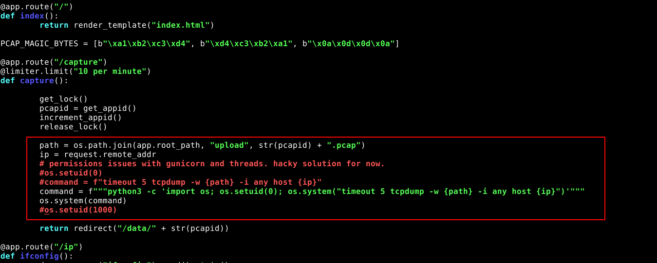 linPEAS doesn’t yield anything interesting. However, reading the source code of the python web app revelealed an interesting block of code I can probably exploit. It contains the code that captures the packets using tcpdump;