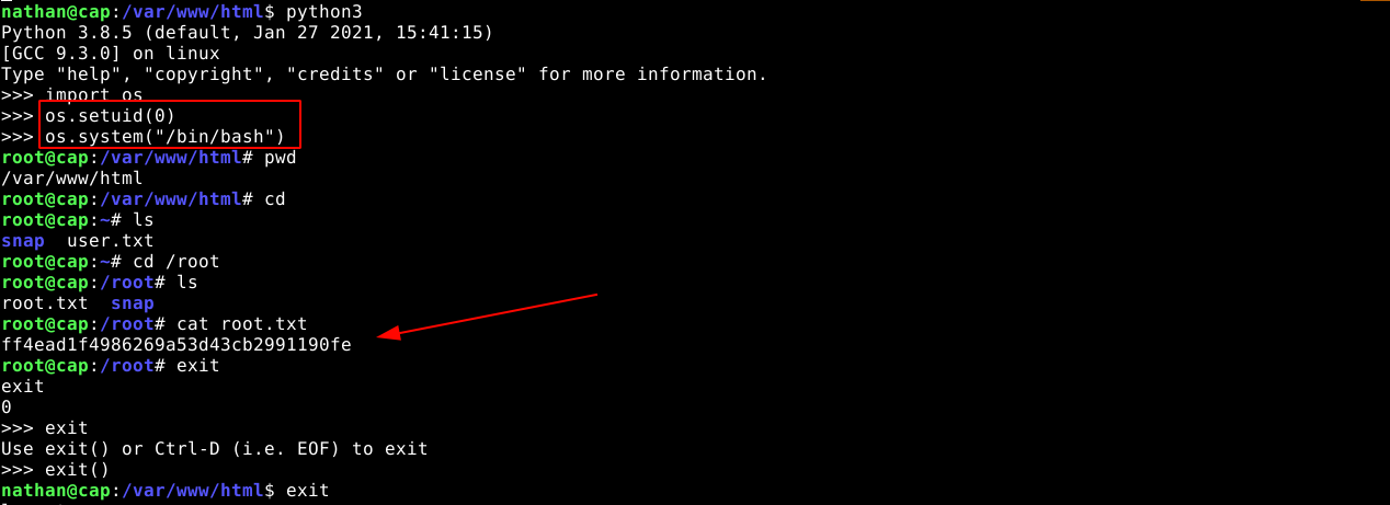 Looking at the code file permissions, I noticed it those not have any special permissions, but manages to execute tcpdump and capture packets, which is clearly a privileged operation. The call to python3 highlighted above is also direct with no special permissions, which indicate privileges are acquired by the call to os.setuid(0). So I opened a python3 shell as nathan, and execute the os.setuid(0) command, which gave me root privileges that I used to spawn a bash shell;