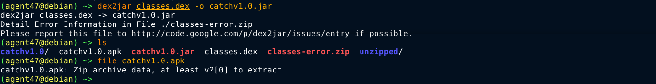 After some local testing, step 6 appears to be exploitable if we can inject a command in the name of the app we drop into the /opt/mdm/apk_bin directory. My first attempt was to do this using apktool. I used the catchv1.0.apk app downloaded earlier from the site. For some reasons, apktool is unable to compile the decompiled and modified APK, so I started looking for other alternatives.