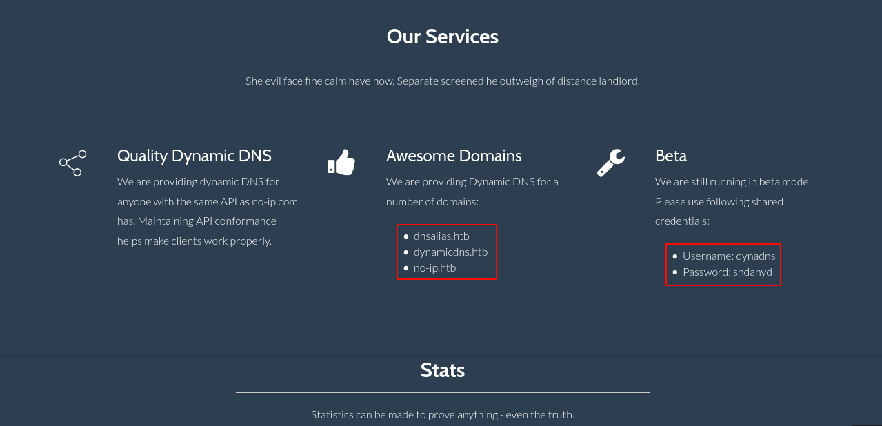Found a credential in the homepage dynadns:sndanyd, and an email address dns@dyna.htb;