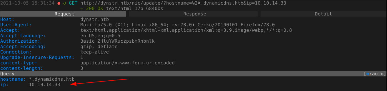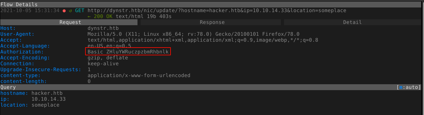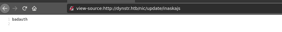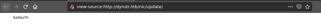 /nic/updateby bruteforcing withffufandgobuster. Requesting the path showedbadauth, but passing the credentials discovered previously gives anochg <user-IP>response. - Some googling showed that