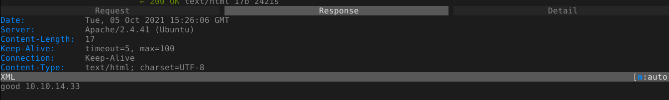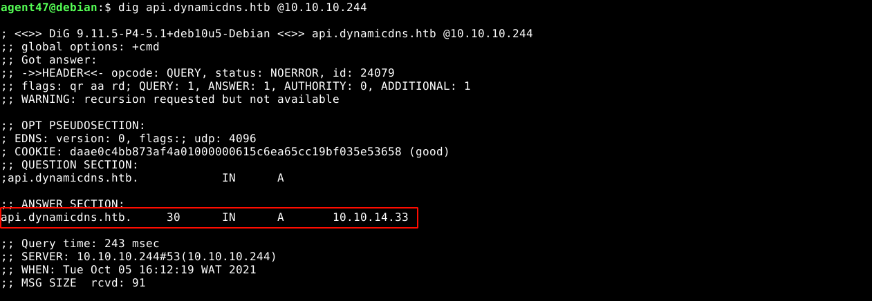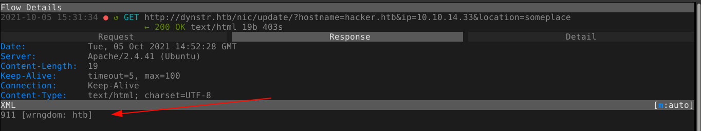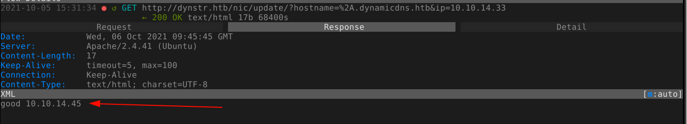 After resuming testing the next day, I discovered something weird: DNS updates are returning a different IP in response. The IP included in the request was the IP I was assigned the last time I connected to the HTB VPN, and the IP in the response is my current IP;