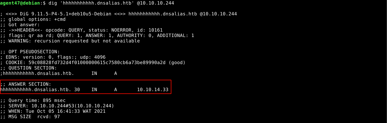 I started listeners using netcat in both TCP and UDP modes, but didn’t get any requests. So I setup a wildcard rule *.dnsalias.htb to match all subdomains, which works, but I still didn’t get any callbacks;
