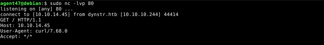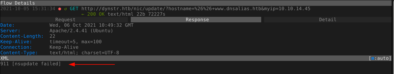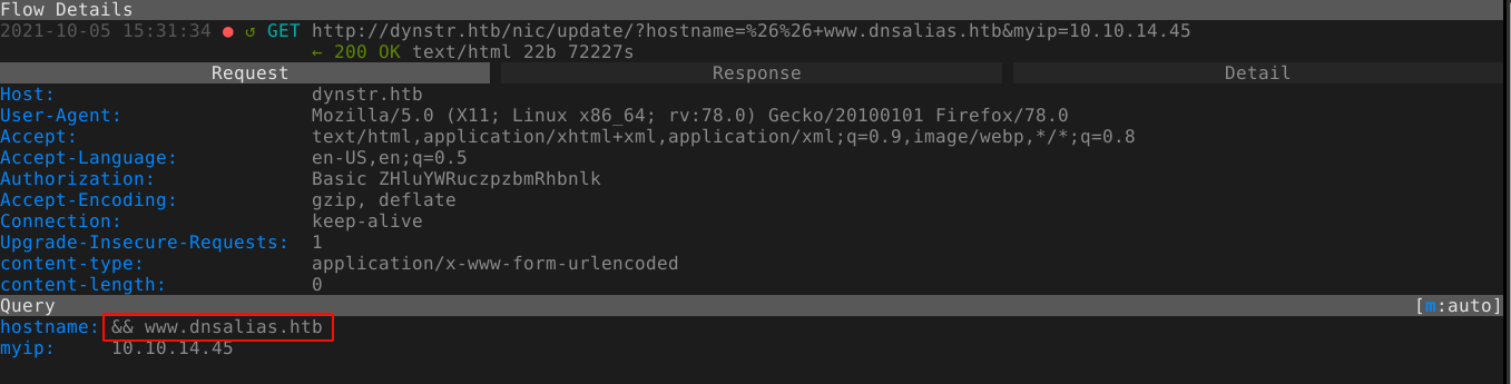 After discovering a possible command injection flaw in the hostname GET parameter passed to http://dynstr.htb/nic/update, I tried to gain code execution by joining commands using linux ;, &&, and || operators. None of them worked. The web app also seems to be checking if the submitted hostname ends with a valid domain, in this case either dnsalias.htb, no-ip.htb, and dynamicdns.htb.