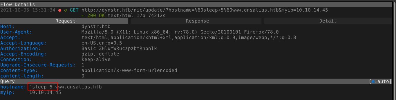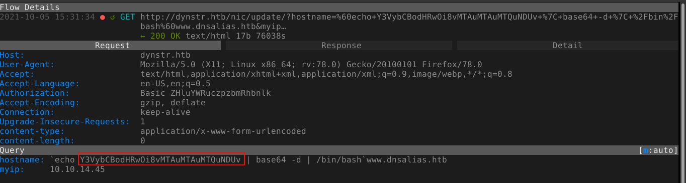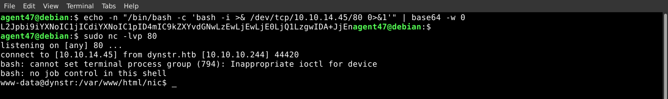 /nic/updateis used to update DNS records, and takes the parametershostname,myip, andlocation. The parameterhostnamewas found to be vulnerable to command injection through fuzzing after a response mentioningnsupdate, which is a command-line tool for updating DNS records, was returned. Base64-encoding allows for more complex commands to be injected. This was exploited to gain a foothold into the box as the web userwww-data. - Inside the box as