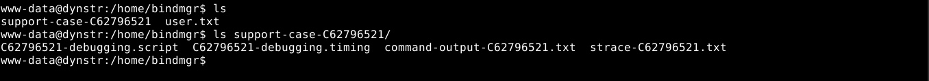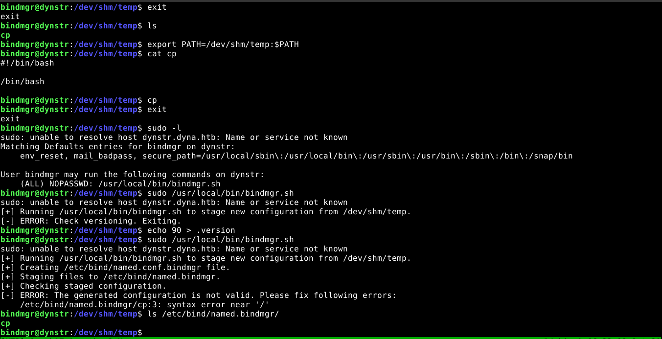 Inside the box www-data, 2 local users were identified (dyna and bindmgr). Some log files generated by the script utility were obtained in the home directory of bindmgr. Going through the log files, I was able to recover an SSH private key for the user bindmgr, but couldn’t get access as the SSH key is mapped to a specific hostname. After bypassing this, I got access to the box as bindmgr over SSH, and exploited a custom script to gain code execution as root.