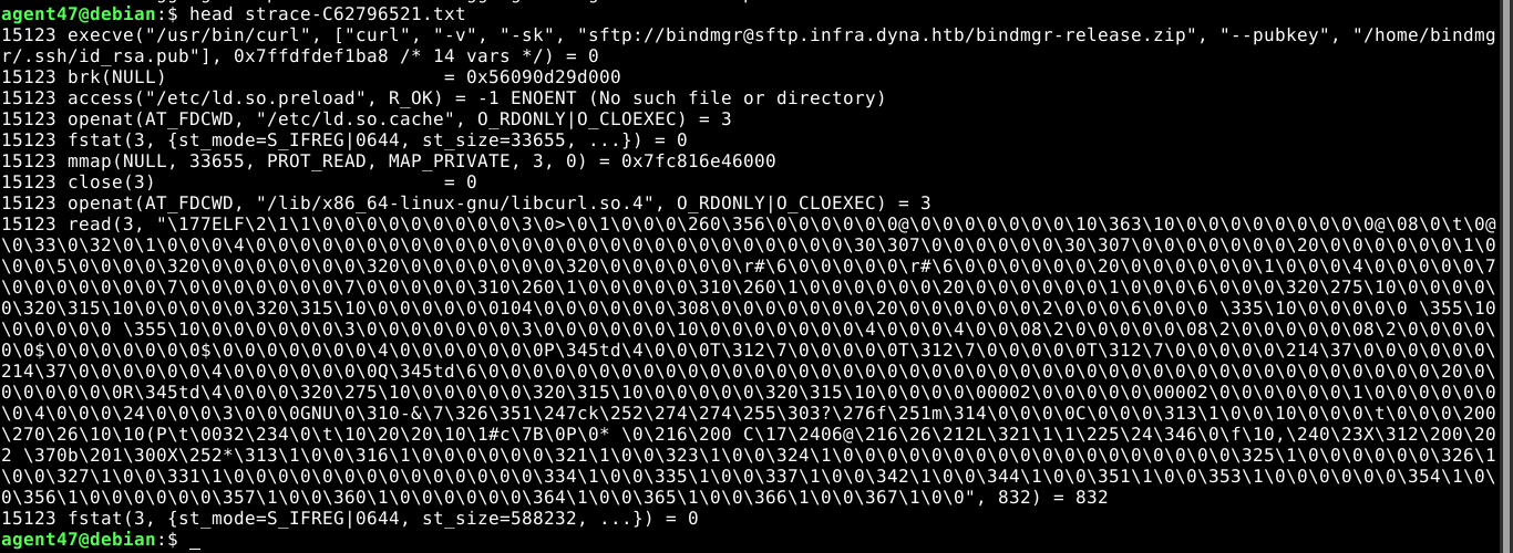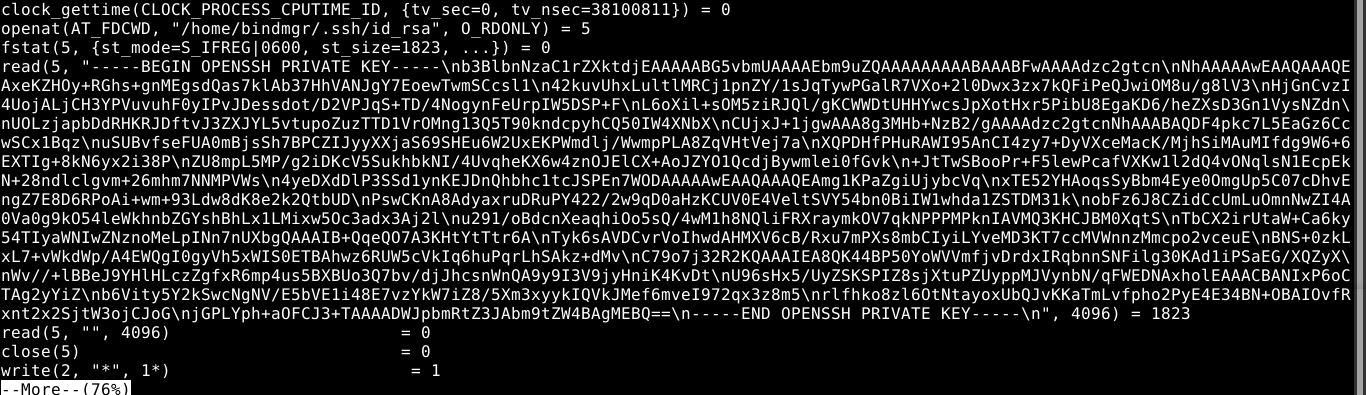 This is also a very interesting file for me as the console log generated by script is very neat and will be easier to analyse. Going through the file, I noticed multiple outputs of strace. Towards the end of the file, the user bindmgr attempted a public key SSH authentication. Since strace was executed during the authentication, it captured the system call used by the SSH client to load the SSH private key of the user bindmgr from disk;