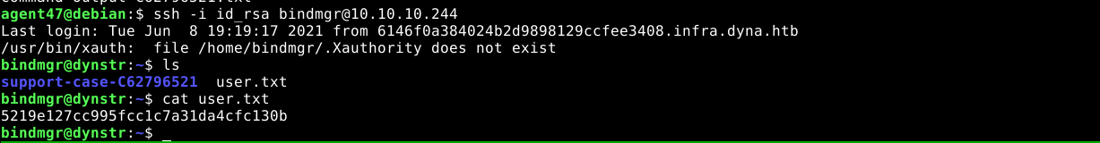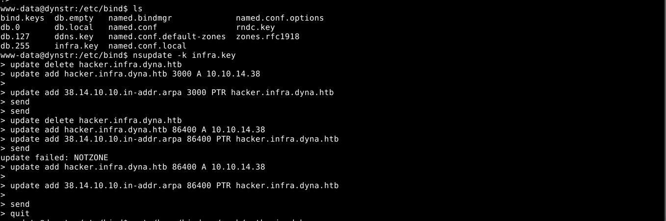 bindmgrusing the extracted SSH private key failed. Checking/home/bindmgr/.ssh/authorized_keysshowed that access is limited to hosts that match*.infra.dyna.htb. Using the key file at/etc/bind/infra.keyand thensupdatetool, I mapped my IP tohacker.infra.dyna.htb, which satisfied the SSH requirement, and gave me access to thebindmgraccount, and the user flag.