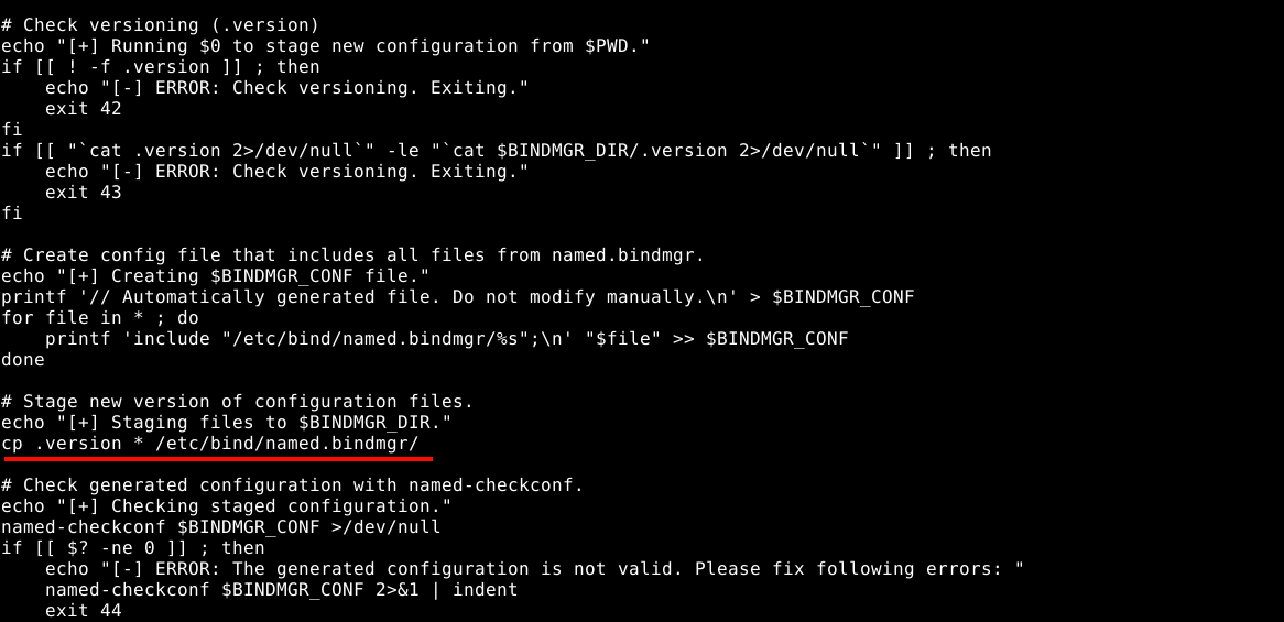 The script checks for the file .version in the current working directory. If it does not exist, it aborts. If it does, it compares it’s value against the .version file in /etc/bind/named.bindmgr. If the value in the first .version file is higher, it copies the version file and any other file in the working directory to /etc/bind/named.bindmgr;