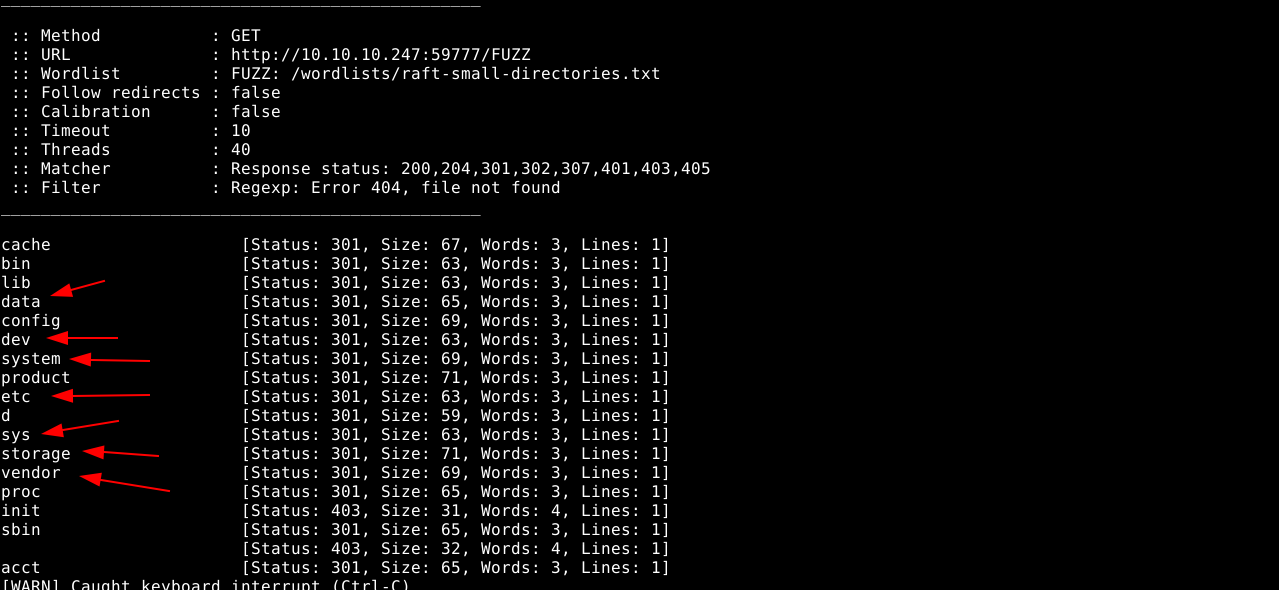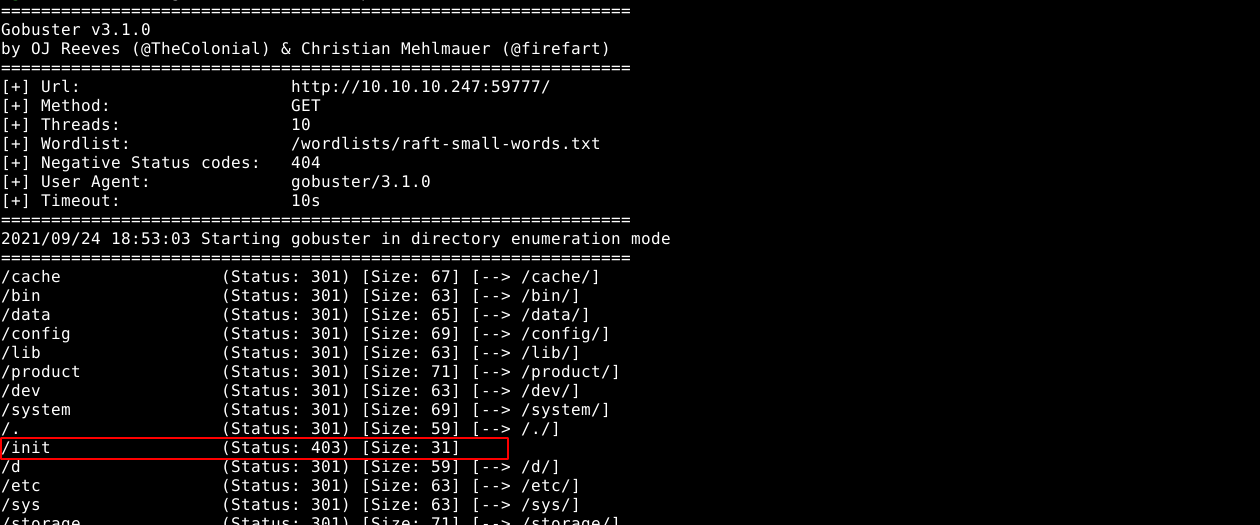 Fuzzing the init/ folder didn’t reveal anything of importance. However, continuous fuzzing of the root directory with ffuf found some folders;