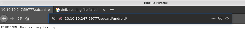 gobusterreveals a file structure similar to that of android devices. - Obtained user flag at