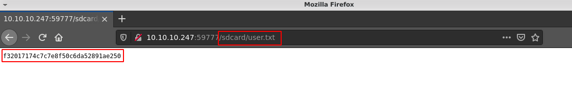 Since internal storage is the home of an android user, request to user.txt inside the /sdcard revealed the user flag;