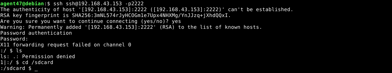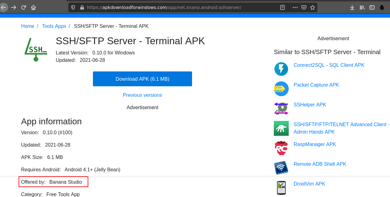 My initial target of choice for foothold is the SSH server running on port 2222. It has been identified as SSH Server Banana Studio (net.xnano.android.sshserver) in it’s service banner, and provides a username and password login. Google searches lead me to this app;