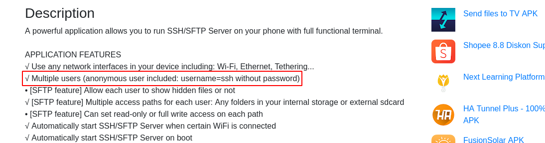 - Tracked down the application that provide the SSH service running on the host on port 2222, and installed it on an android device for testing.