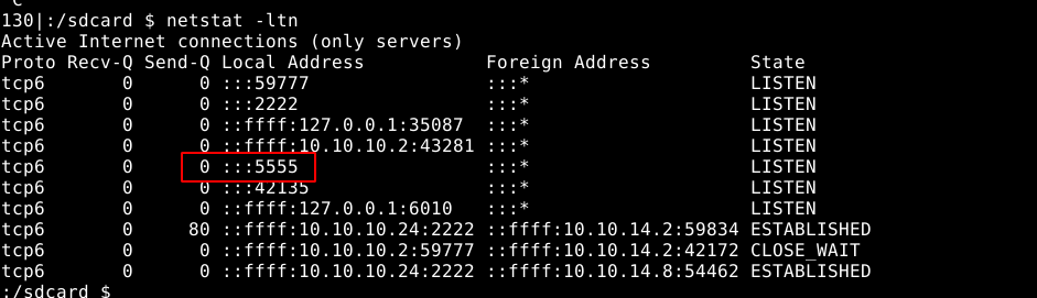 Querying for listening services showed that port 5555, which NMAP reported earlier as filtered, is running;